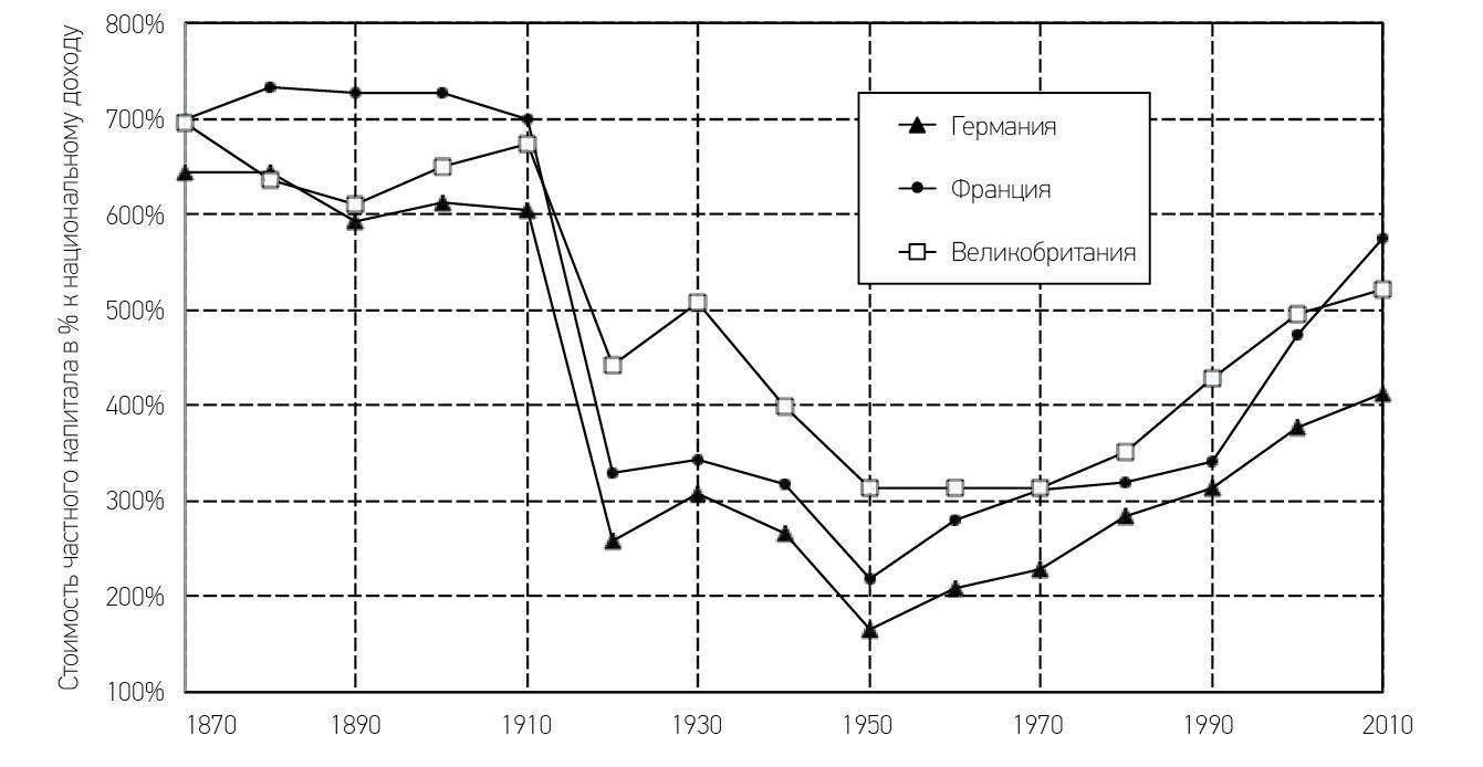 Примечание. Стоимость частного имущества составляла от 6 до 7 лет национального дохода в Европе в 1910 году, от 2 до 3 лет в 1950 году и от 4 до 6 лет в 2010 году. Источники: piketty.pse.ens.fr/capital21c.