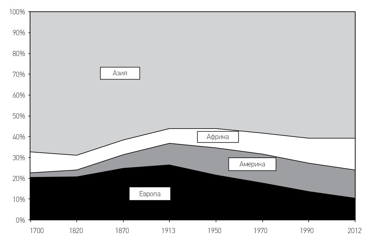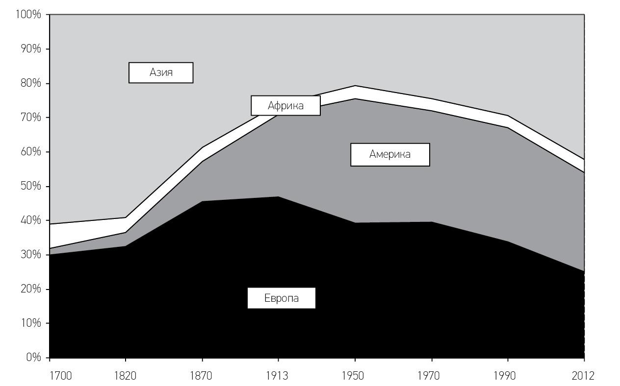 Между 1900 и 1980 годами от 70 до 80% мирового производства товаров и услуг приходилось на Европу и Америку, что отражало их экономическое доминирование над остальным миром. Эта доля стала постепенно снижаться, начиная с 1970–1980-х годов. К началу 2010-х годов она сократилась до 50% (приблизительно по четверти на каждый континент), т. е. примерно до уровня 1860 года. Вероятнее всего она будет снижаться и впредь и в течение XXI века опустится до 20–30%. Этот уровень держался до начала XIX века и больше соответствует доли Европы и Америки в мировом населении (см. графики 1.1 и 1.2).