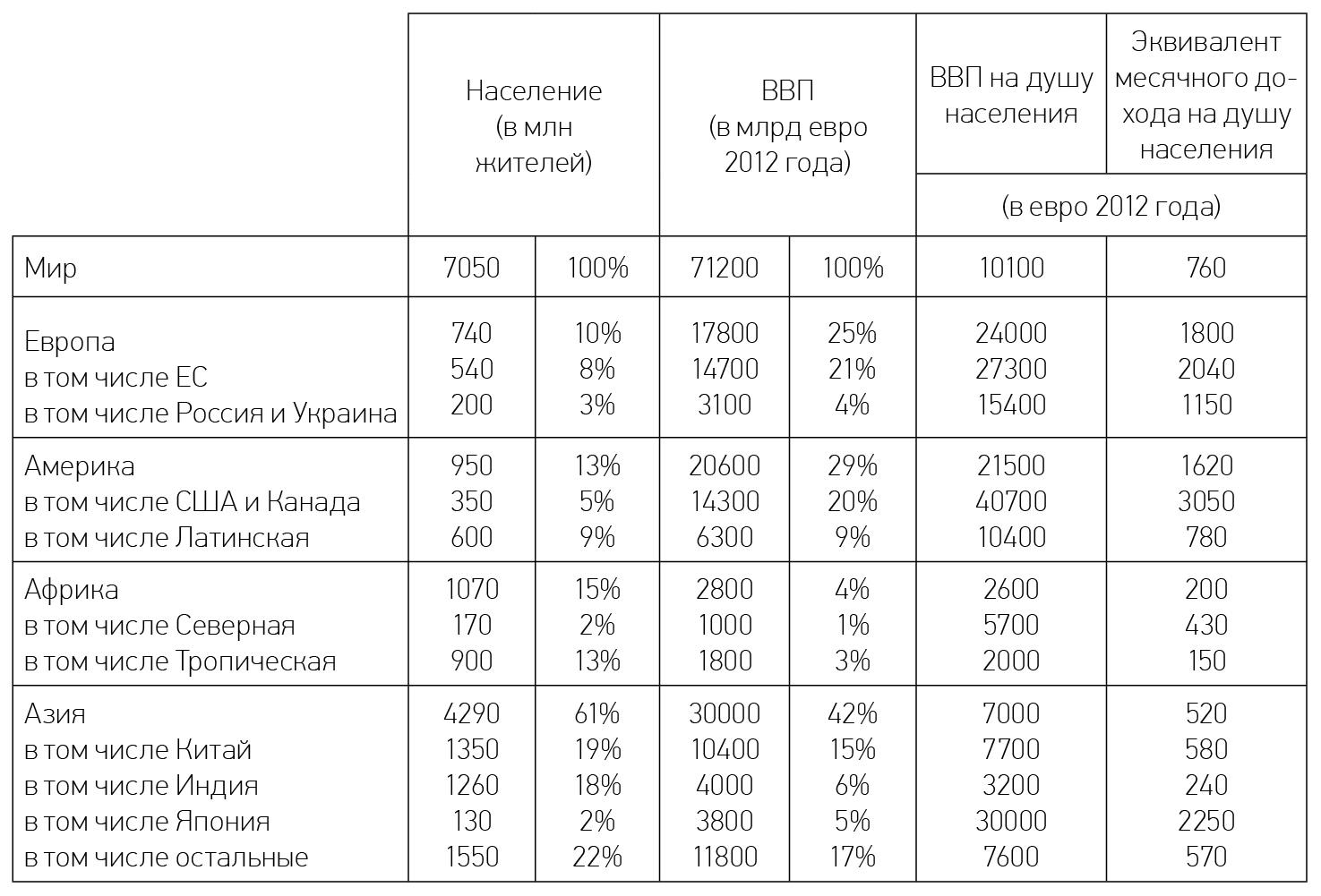 Население мира в 2012 году приближалось к семи миллиардам человек, а мировой ВВП немного превышал 70 триллионов евро, вследствие чего ВВП на душу населения составлял ровно 10 тысяч евро. Если изъять из него 10% обесценения капитала и разделить оставшуюся сумму на двенадцать, то полученный в результате ежемесячный доход на душу населения будет равняться 760 евро, что более чем показательно. Иными словами, если мировое производство и обеспечиваемые им доходы были бы распределены совершенно равномерно, то каждый житель планеты располагал бы доходом, равным 760 евро в месяц.Население Европы насчитывает 740 миллионов жителей, из них 540 миллионов проживает в Европейском союзе, где ВВП на душу населения превышает 27 тысяч евро, и еще 200 миллионов в блоке России и Украины, в котором ВВП на душу населения составляет порядка 15 тысяч евро, т. е. всего на 50% выше среднего мирового уровня [059]. Сам Европейский союз довольно разнороден, поскольку 410 миллионов из его населения проживает в бывшей Западной Европе (из них три четверти приходится на пять самых населенных стран — Германию, Францию, Великобританию, Италию, Испанию), где средний ВВП достигает 31 тысячи евро, а остальные 130 миллионов человек живут в бывшей Восточной Европы со средним ВВП около 16 тысяч евро, что мало отличается от блока России и Украины [060].
