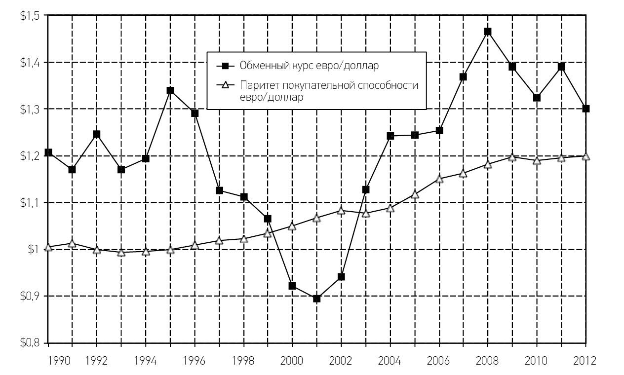 Другое преимущество использования паритета покупательной способности заключается в том, что он по природе своей более стабилен, чем текущий валютный курс. Последний отражает не только состояние предложения и спроса на товары и услуги, которыми обмениваются разные страны, но и резкие скачки в стратегии размещения международных инвестиций, изменчивые предсказания относительно политической и финансовой стабильности той или иной страны, не говоря уже об эволюции денежной политики, зачастую довольно хаотичной. Текущий валютный курс может быть чрезвычайно переменчивым, как свидетельствуют сильнейшие колебания курса доллара в последние десятилетия. Обменный курс упал с 1,30 доллара за евро в 1990-е годы ниже 0,90 доллара в 2001 году, затем стал стремительно расти и достиг отметки в 1,50 в 2008 году, после чего снизился до 1,30 доллара в 2012 году. В течение этого времени паритет покупательной способности плавно увеличивался — примерно с одного доллара за евро в начале 1990-х годов до приблизительно 1,20 доллара за евро в начале 2010 годов (см. график 1.4) [063].