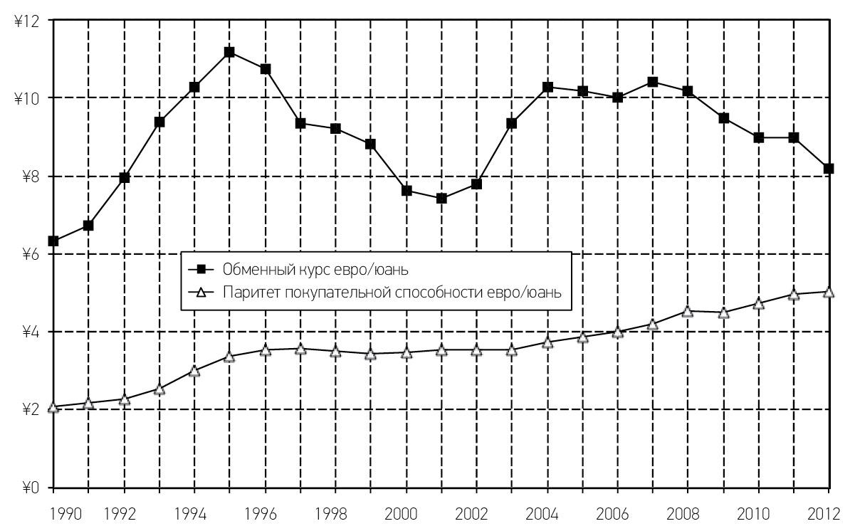 В самых бедных странах поправки, учитывающие паритет покупательной способности, очень велики: в Африке и в Азии цены приблизительно в два раза ниже, чем в богатых странах, вследствие чего ВВП вырастает примерно в два раза, когда он выражается не в текущем обменном курсе, а посредством паритета покупательной способности. Это объясняется прежде всего более низкими ценами на услуги и товары, которыми не обмениваются на международном рынке и которые проще производить в бедных странах, поскольку они требуют больше неквалифицированного труда (этого фактора в менее развитых странах сравнительно больше) и меньше квалифицированного труда и капитала (их в этих странах сравнительно меньше) [065]. Обычно поправки тем выше, чем беднее страна: в 2012 году поправочный коэффициент составлял 1,6 для Китая и 2,5 для Индии [066]. В настоящее время евро стоит восемь китайских юаней по текущему обменному курсу и пять юаней по паритету покупательной способности. Это расхождение сокращается по мере того, как Китай развивается и ревальвирует юань (см. график 1.5). Тем не менее, некоторые авторы, в том числе Мэддисон, полагают, что расхождение на самом деле меньше, чем кажется, и что официальная статистика недооценивает китайский ВВП [067].