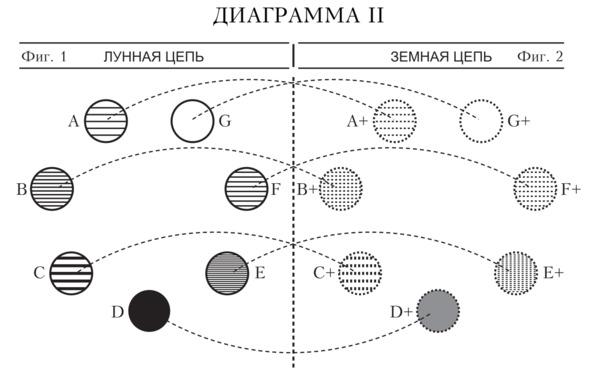 2. Эти сферы от A до G (на Диаграмме I) формируются процессом, называемым оккультистами «возрождением» планетных цепей. Планетная цепь образована именно семью сферами. Когда седьмой и последний (на сфере G) Круг начинается, высшая (или первая) сфера А и с ней все другие в последовательности от A до F начинают умирать. Планетарное разложение (Пралайя) приближается; каждая планета, следуя эволюционным путём, должна передать свою жизнь и энергию другой планете (См. Диаграмму II, взаимодействие Луны и Земли).