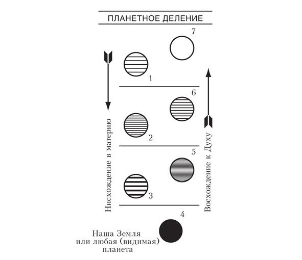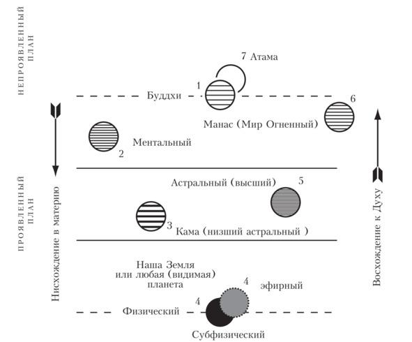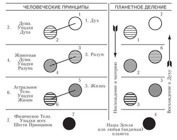 Для случая Земли, когда затрагивается состав человека, была принята шкала из четырех низших планов проявленного мира и трех — непроявленного, итого — семь (см. Диаграмму I). Планета Земля в результате объединения нескольких волн эволюции состоит из семи сфер, подобных семи принципам (телам) человека. Любая планета, проходя последовательно фазы развития (на рисунке для Земли от 1 по 7), пробуждает к активности последовательно тот или иной принцип. При этом уже развитые ранее принципы остаются в том или ином виде активными.