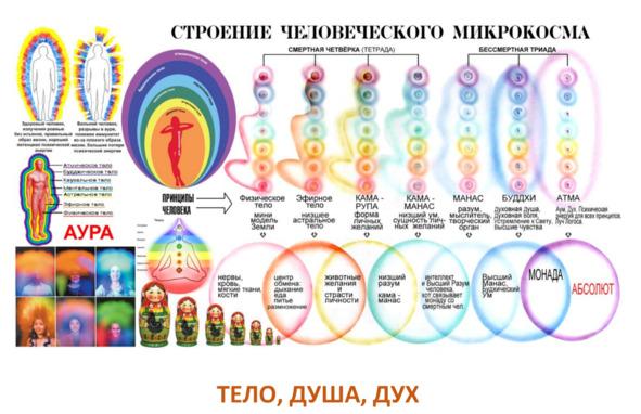 Человек (микрокосм) является отражением проявленного Абсолюта (макрокосма), и его истинное внутреннее «Я» вечно и едино с Божественным «Я» Вселенной. Эволюция человека совершается путём многочисленных воплощений (рождений в физическом мiре), в которых он приобретает опыт, знания и через самопожертвование, служение людям становится активным участником божественного плана преобразования и строительства жизни как на Земле, так и во всей Вселенной.