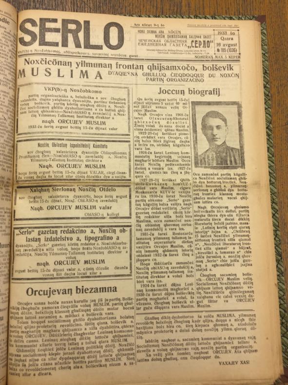 Газета «Серло» 1933 шо 16 август №185 (1036). Некролог. Вайн махкахь кхин д1а юхахь Къилбседа Кавказехь 1ашболчу нахана ца боьвзуш, бицбелла историйн аг1онашна арахь бисина баккхий 1илманчаш бу. Тахана Орцуев Муслим керла ваккха лаьара суна, йицъян йиш йоцуш йицйина ц1е йолуш таг ву аьлла хета суна.
