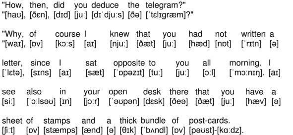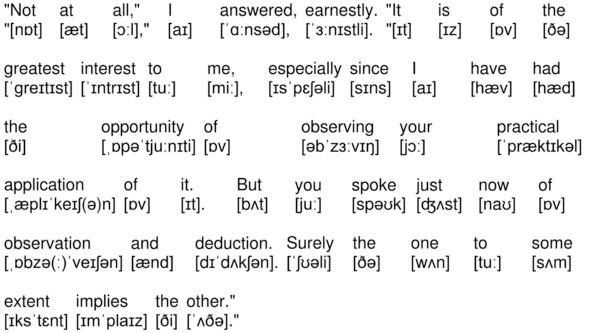 «Why, hardly,» he answered, leaning back luxuriously in his arm-chair, and sending up thick blue wreaths from his pipe. «For example, observation shows me that you have been to the Wigmore Street Post-Office this morning, but deduction lets me know that when there you dispatched a telegram.»