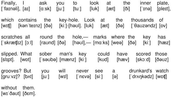 Finally, I ask you to look at the inner plate, which contains the key-hole. Look at the thousands of scratches all round the hole, — marks where the key has slipped. What sober man’s key could have scored those grooves? But you will never see a drunkard’s watch without them.