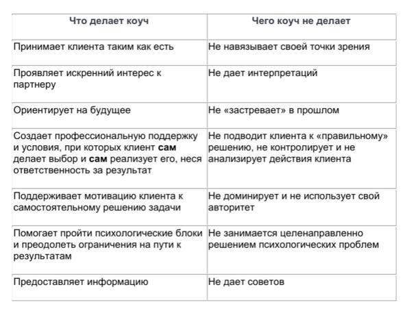 Подводя итог в теме философии и определения коучинга, сведём в таблице некоторые из вещей, которые делает коуч, и которые коуч не делает.