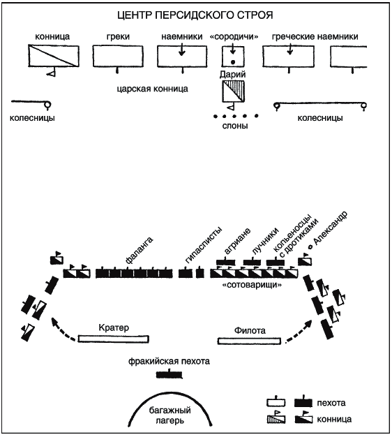 Свою передовую позицию персы установили в Арбелах, откуда Дарий перешел на тридцать пять миль западнее. Там обширную равнину подготовили для планируемых военных действий: выровняли пригорки и убрали все препятствия. У Дария было двести серпоносных колесниц, неизвестных македонцам и обладавших разрушительной силой. Колесницы он поставил впереди, намереваясь с их помощью дезорганизовать фалангу. В середине ряда колесниц перед тем местом, где должен был находиться Дарий, встали пятнадцать боевых слонов, пригнанных с Инда. Можно было не сомневаться, что Александр ударит в направлении персидского царя, как это было в Иссе, и самолично возглавит конницу гетайров; слоны должны были прорвать его боевой порядок.