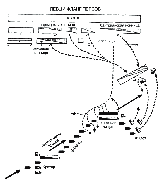Вместо наступления, Александр развернул фронт на 45 градусов направо (налево со стороны персов), под его личным руководством тяжелая конница передвигалась быстрее обычного. Дарий, видя, что они подходят к границе выровненной местности, где могли оперировать колесницы, приказал коннице левого края приостановить этот маневр. Александр ответил тем, что выдвинул вперед греческих конных наемников под началом Филота; но персы отогнали их назад. Когда следом в бой вступила легкая конница Арета, Бесс пустил в ход бактрианских и скифских всадников. Последовало ожесточенное сражение между всадниками с участием гетайров; вокруг поднялось такое густое облако пыли, что трудно было что-нибудь разглядеть. Доспехи у бактриан были лучше, и сначала македонцы несли тяжелые потери; но воины Александра умели наносить резкие и частые удары сплоченными отрядами, тогда как азиаты бились беспорядочной кучей. Они не справлялись с пехотой, поддерживавшей фланг, и в конце концов были вынуждены отступить.
