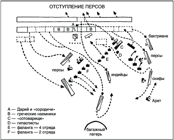 Но отряд фаланги, еще не занятый в центре, развернулся и с тыла атаковал персов и индийцев, грабивших лагерь. Вражеские отряды не могли выстоять против напора македонцев и начали пятиться, и в этот момент гетайры во главе с Александром ударили по ним с тыла. Тогда разразилась самая отчаянная битва дня, в которой Александр потерял шестьдесят гетайров из двух сотен своих лучших «сотоварищей», прежде чем последние боевые отряды врага были уничтожены. Перед тем как расположиться на ночную стоянку, армия Александра предприняла тридцатипятимильный форсированный марш, преследуя теперь уже бывшего царя Персии.
