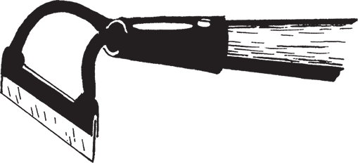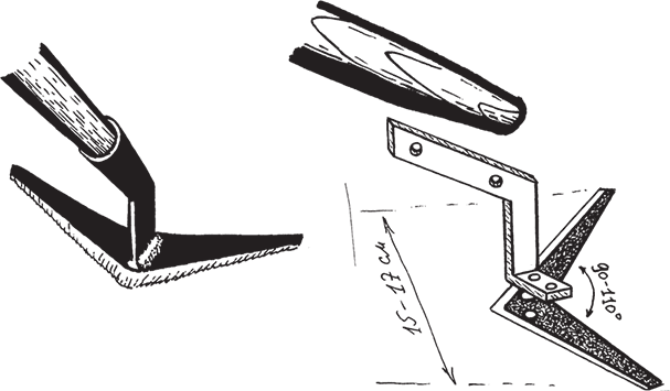 По форме напоминает летящего стрижа или наконечник стрелы и соответствует этим образам: легко пронзает толщу земли. Любопытный момент: к этому полольнику нужно приладиться. Сначала может показаться, что им невозможно работать: он так легко режет почву, что при нажиме заглубляется, точно плуг трактора. И только спустя время, когда ваши руки начнут чувствовать этот инструмент и найдут нужное усилие, лезвие станет легко «гулять» по верхнему сантиметру почвы, срезая у сорняков узлы кущения – как раз то, что надо. Он очень хорош для плотной глинистой почвы. «Стрелка» от хорошего производителя – настоящий шедевр орудия труда: сталь закаленная, исключительно прочная, на режущей кромке имеются дополнительные зубчики, как у серпа, – режет все на своем пути, как масло. Этот полольник несложно сделать самостоятельно, выпилив лезвие, скажем, из старой лопаты, как показано на рисунке. У самодельного лезвия я бы рекомендовал сделать более острый угол.