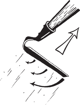 Освойте верное движение: ход лезвия старайтесь направлять немного наискось, чтобы оно входило в почву уголком, так сопротивление меньше, чем при просто рубящем положении. При возвратном движении касайтесь лезвием земли, чтобы счищать с него траву. Желательно рассечь крупный сорняк дважды: