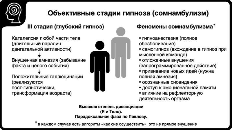 • И, наконец, глубокий гипноз (сомнамбулизм), когда внушения выполняются беспрекословно.
