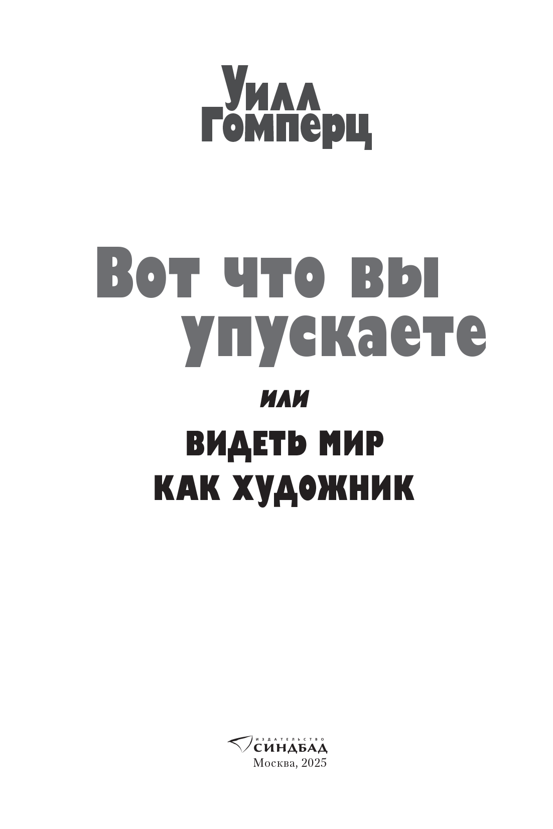 В этой книге признанный авторитет в мире искусства Уилл Гомперц, автор мировых бестселлеров «Думать как художник» и «Непонятное искусство. От Моне до Бэнкси», рассказывает о творчестве ряда выдающихся старых мастеров и современных звезд и показывает, как смотреть на мир, чтобы упускать как можно меньше.