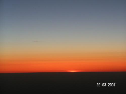 Україна ще спить. Зрідка деінде блисне самотній безсонний вогник на чийомусь підвіконні, нагадуючи відому повість А. Екзюпері «Нічний політ», і знову під крилом суцільна темрява. А попереду, ще не помітна на землі, розгоряється ранкова зоря. Перші проміні сонечка зустріли нас лише над Чорним морем, осяявши рожевим світлом безкрайню снігову рівнину, створену хмарами. Хмари стали неохоче розступатися лише над скелями Туреччини, а над Середземним морем вже нагадували про своє існ