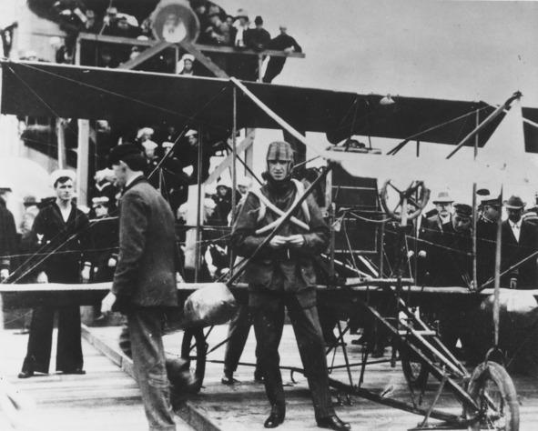 Юджин Эли у биплана Кёртисс «Голден Флаер» на полётной палубе-наклонной платформе крейсера ACR-4
