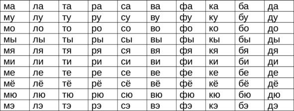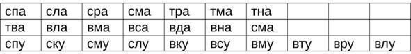 — Тренер берёт лист бумаги, закрывает столбец со слогами, открывает по одному слогу и быстро закрывает его, ребёнок должен успеть прочитать и т. д.
