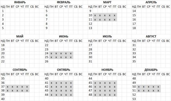 В результате этих размышлений в течение следующих 10 лет (2003–2012 гг.) постепенно сложилась модель управления, о которой я расскажу. После того как я ее выстроила, моя «обязательная программа» стала занимать 16 недель в году (рис. 2. Календарь генерального директора):