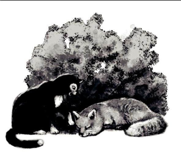 Мистер Лис поднял глаза и обнаружил перед собой хозяина лапы — Сэра Кота. Глядя на него, становилось сразу понятно, что он не просто Кот и не какой-то там мистер, он именно Сэр! Чёрная ухоженная шубка, белые перчатки и манишка. И белый круг вокруг одного глаза, напоминающий пенсне.