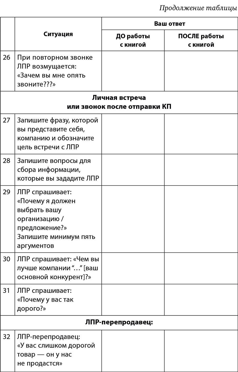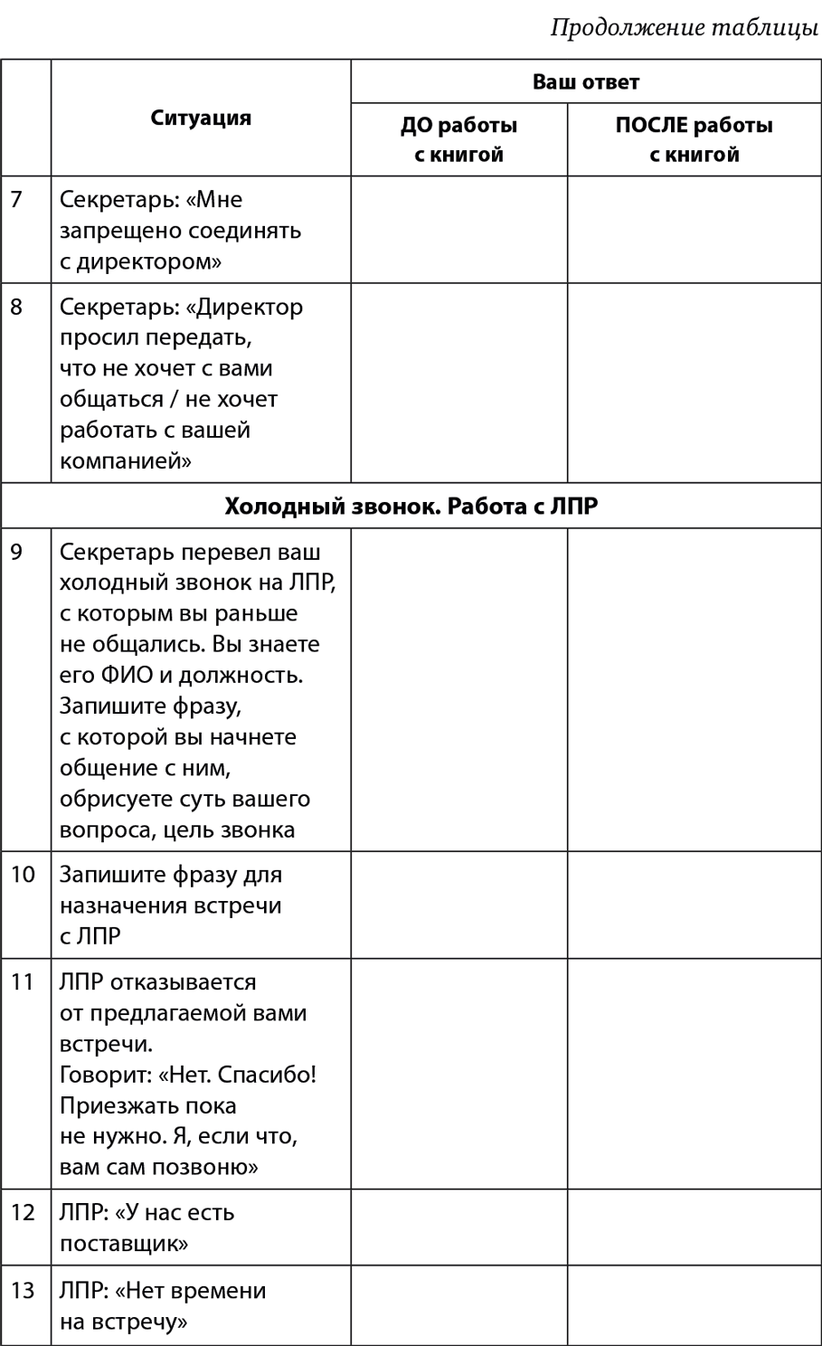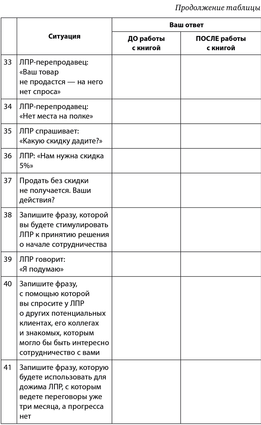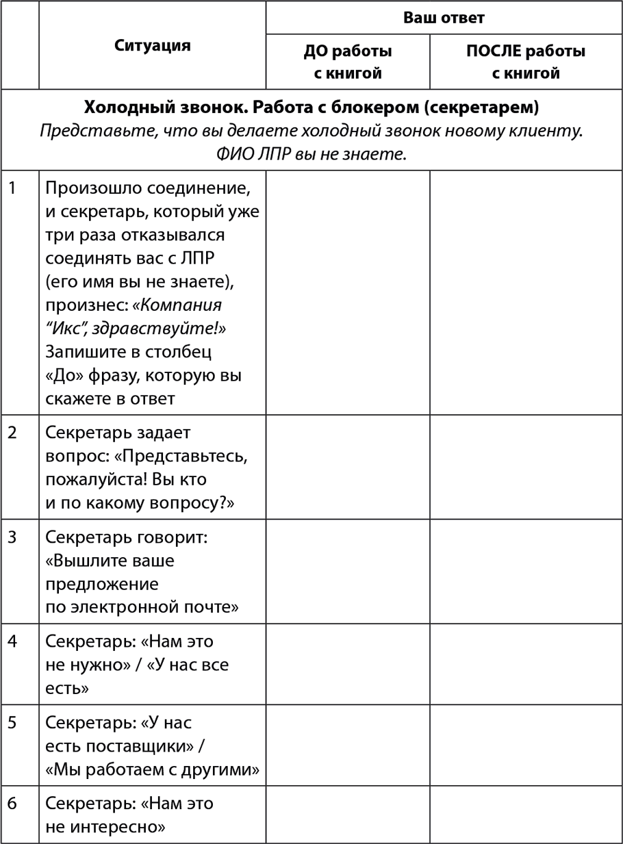 В ходе работы с книгой, разбирая ту или иную ситуацию, мы постоянно будем возвращаться к вашим ответам, анализировать их с разных точек зрения, находить ошибки и сильные места, сравнивать ваш ответ с предлагаемыми мной приемами. После изучения каждой главы вносите итоговый вариант речевого модуля, который вы будете применять, работая с клиентами, в столбец «После работы с книгой». Таким образом, к моменту окончания чтения у вас появится персональный скрипт продажи — шпаргалка с ответами и алгоритмами действий практически для всех сложных ситуаций. Ее внедрению в каждодневную работу будет посвящена глава 16. А пока давайте приступим к заполнению теста. Запишите ваш дословный ответ в столбец «До работы с книгой».