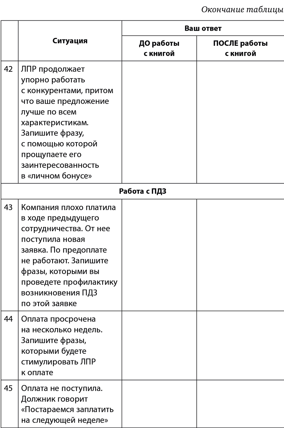 Хотите оценить свой уровень как продавца и увидеть «зону роста»? Замечательно! Ниже приведен тест, включающий описание 45 классических ситуаций, с которыми сталкивается в своей работе практически каждый продавец в сфере B2B. Настоятельно рекомендую перед началом работы с книгой пройти его, записав дословно фразу, которую вы используете в той или иной ситуации, в столбец «До работы с книгой».