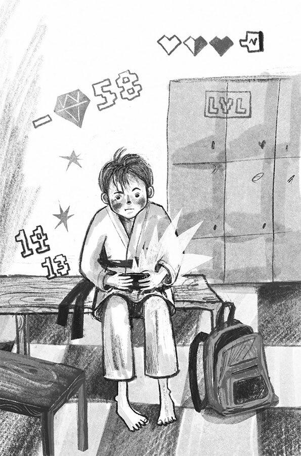 Шурупчик прибрался в зале, вошел в опустевшую, пропахшую по́том раздевалку. Не снимая кимоно, достал из рюкзака потертый смартфон и открыл недавно скачанное приложение «Бой с Тенью – 2». Версия оказалась староватой, но Шурке приглянулась: денег не требовала, да и рекламой особо не заваливала. В школе на большой перемене он одолел последнего телохранителя босса – Журавля, и ему предстояла решающая битва с самим Отшельником.