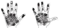 Элементарная рука – крепкая, тяжелая, малоподвижная, с короткими, как бы притупленными пальцами, несколько отогнутыми назад (рис. 10). Большой палец невелик и неуклюж, а из-за неразвитой подвижности совершенно не гнется назад. Часто он весьма укорочен, неправильной формы и оканчивается почти у основания указательного. Ладонь – широкая, толстая, твердая, квадратной формы. Кожа грубая и жесткая, часто красноватого или смуглого тона. Она часто покрывается (это особенно характерный признак данного типа руки) на наружной части волосами, а на ладони – ороговевшими мозолями. Количество линий на ладони элементарного типа очень невелико; из них хорошо выделены и просматриваются лишь 3–4 главные. В дополнение к этому следует упомянуть крепкие и широкие ногти. По выражению одного хироманта, «элементарная рука напоминает, с одной стороны, форму руки маленького ребенка, а с другой стороны, форму руки человекоподобных обезьян». Большинство людей с элементарной рукой – мужчины, а данный хиротип – не редкость в рабочей среде, у людей, занятых физическим трудом, работа которых не требует напряженной умственной деятельности. В своей профессии и повседневной жизни они основываются на физической силе, привычках и инстинктах. Главным жизненным кредо таких субъектов является удовлетворение естественных нужд, прагматичность и жесткая ориентировка на материальный мир. Они консервативны, осторожны и медлительны, любят много и сытно поесть, хорошо выпить и выспаться, удовлетворив свое сексуальное начало. К жизни особых требований не предъявляют, но нуждаются в постоянной поддержке и грамотном руководстве. Не стремятся к переменам и предпочитают стабильную и предсказуемую рабочую обстановку с минимальным количеством неожиданностей.