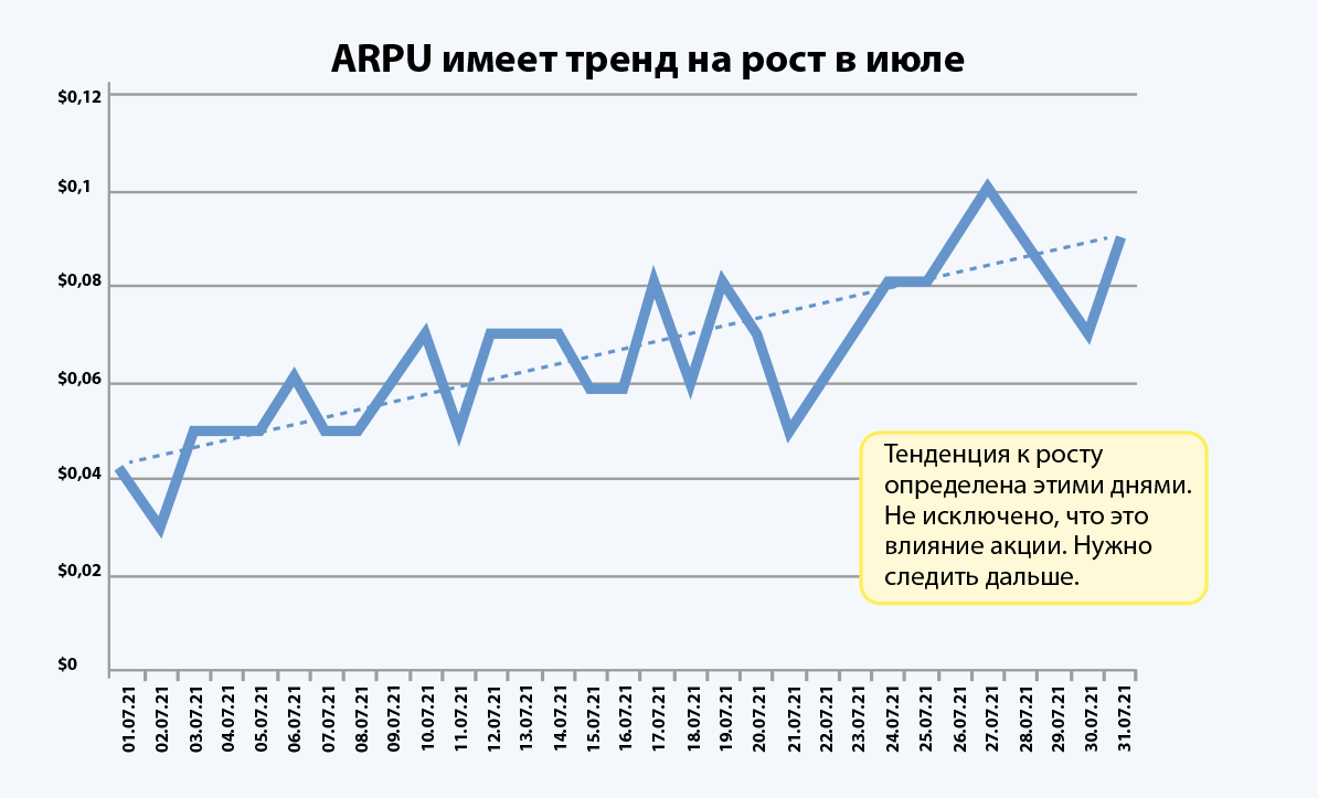 …а не просто ответ на заданный вопрос. Составляя график, подумайте, о чем именно вы хотите рассказать заказчику? На основе одних и тех же данных можно сделать множество выводов. Допустим, ваша задача – указать на статичность показателя, или же, наоборот, заметили тренд на снижение. Вероятно, вы хотите обратить внимание на сезонность, а может быть, прокомментировать скачок показателя в один из дней. Все это – разного рода основные мысли графика. Поэтому, прежде чем приступать к созданию графика, определите для себя, что вы хотите донести?