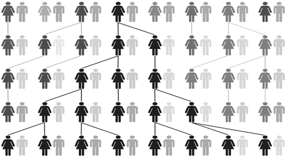 Женщина может иметь потомство, а может и не иметь. В потомстве могут быть как женщины – «передатчики» митохондриальной ДНК, так и мужчины, которые ее передавать не могут. Некоторые потомки выживут и дадут свое потомство, а некоторые не выживут. Для того, чтобы число людей в популяции не изменялось, мы станем считать, что в каждом поколении у пары родителей выживает двое детей.