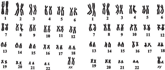 Нормальный хромосомный набор (кариотип) человека представлен 46 хромосомами. Это 22 пары аутосом и одна пара половых хромосом – XY[4] в мужском кариотипе и XX – в женском. Посмотрите на рисунок, и вы увидите, что половые хромосомы получили обозначение по сходству с соответствующими буквами алфавита.