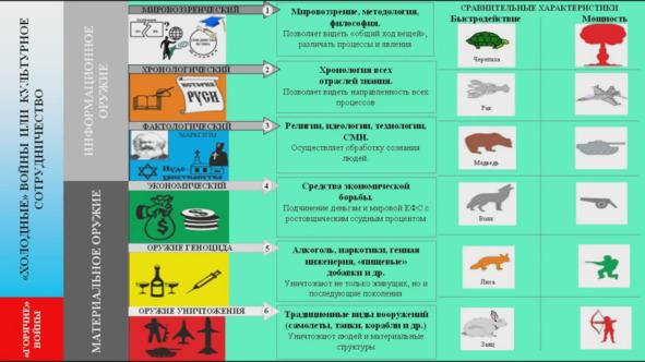 Сегодня уже ни у кого не возникает сомнений, что против нас ведётся новая «холодная война», с использованием всего арсенала, имеющихся на её вооружении средств. Только если традиционное оружие (пистолеты, автоматы, танки самолёты) давно уже классифицировано по мощности и иначе, как в качестве средства завоевания или обороны людьми не воспринимается, то оружие нового типа были классифицированы и обобщены, лишь в конце ХХ века. Как известно первая «холодная война» была объявлена Советскому Союзу после фултонской речи У. Черчилля. Известно так же, что СССР в 1991 году эту войну проиграл. Но если одно государство проигрывает войну другому государству, то объективен вопрос, какими средствами эта война велась. Не просто же так могучая индустриальная держава взяла да и сама собой развалилась? И вот в конце 80-х годов этим вопросам озаботилась группа учёных-аналитиков с факультета «прикладной математики — процессов управления» тогда ещё Ленинградского государственного университета под научным руководительством основателя факультета доктора физико-математических наук, профессора В.И.Зубова. Результатом их работы стала статья, вышедшая в журнале «Молодая гвардия» (№2 1990 год) за подписью кандидата технических наук В. М. Зазнобина «Концептуальная власть: миф или реальность?», в которой впервые было выявлено оружие «холодной войны» в виде шести приоритетов обобщённых средств управления странами и народами. Схематически они могут быть изображены следующим образом.