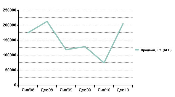 С наивысшей точки — 292 662 шт. в апреле’08 — до низшей — 74 114 шт. в январе’10 — российский авторынок обвалился стремительно, но также стремительно пошёл в рост, уже к декабрю’10 показывая солидные 204 588 шт.