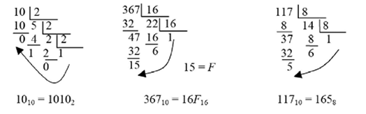 Для обратного перевода из десятеричной системы счисления в систему счисления с основанием s необходимо выполнить последовательное деление десятичного числа на основание s и прочитать число в обратном порядке как показано на рис. 1.1.