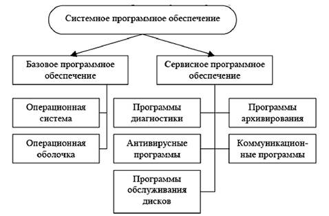 Структурно системное программное обеспечение состоит из базового программного обеспечения – минимального набора программных средств, обеспечивающих работу компьютера, и сервисного программного обеспечения, расширяющего возможности базового программного обеспечения и организующего более удобную среду работы пользователя (рис. 1.6).