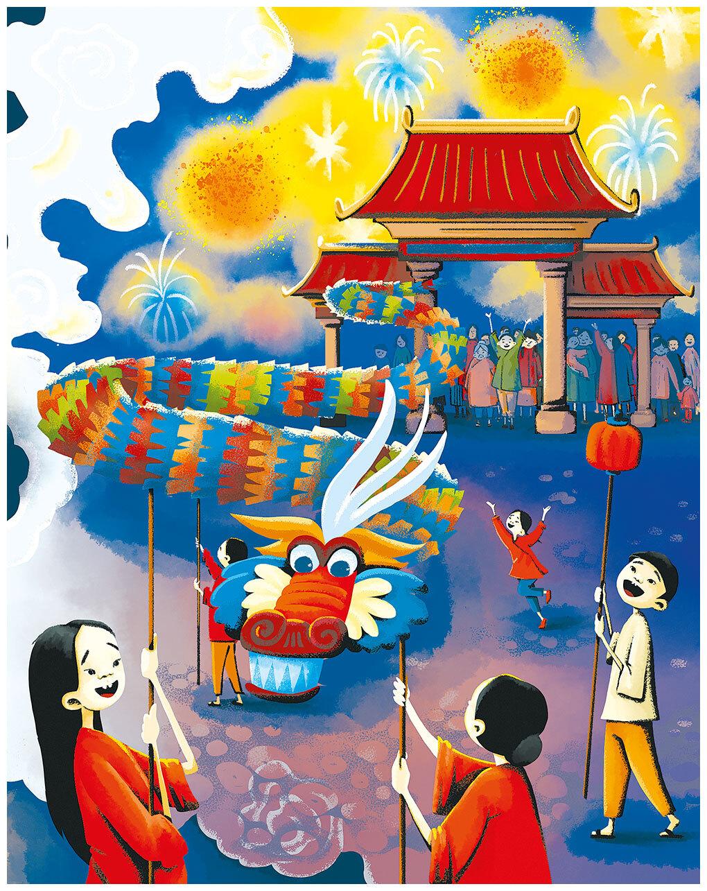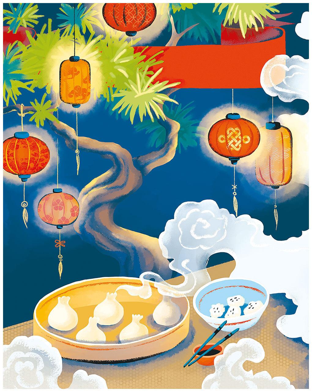Вместо ёлки китайцы украшают бумажными гирляндами и фонариками так называемое «дерево света». На севере Китая в эти дни принято готовить цзяоцзы́ (пельмени), а на юге – закуски из няньгáо (клейкого риса).