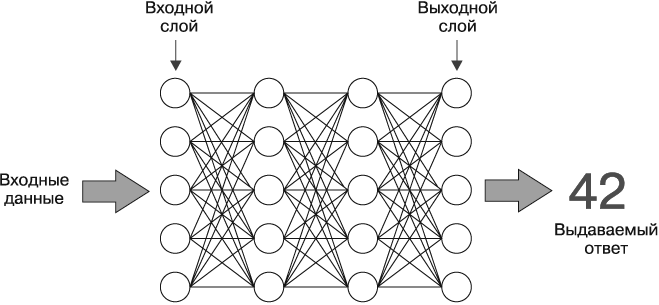 Архитектура (или структура) ИНС обычно включает в себя несколько слоев. Данные поступают в первый слой искусственных нейронов, которые заставляют соединенные с ними искусственные синапсы активировать следующий слой и т.д., пока последний слой нейронов не выдаст окончательный результат. На рис. 1.1 упрощенно показано, как могла выглядеть высокосложная искусственная нейронная сеть компьютера Deep Thought из фантастического романа Дугласа Адамса (Douglas Adams) «Автостопом по Галактике», написанного в 1979 году.1 Она принимает на вход данные и возвращает смысл жизни.