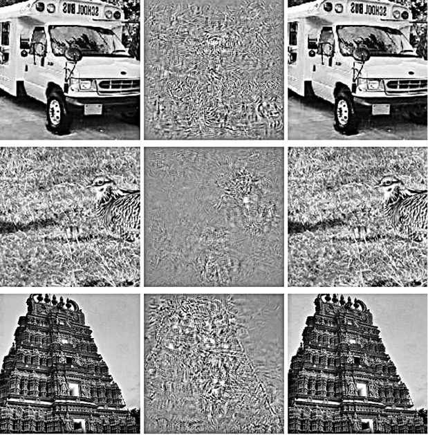 На рис. 1.2 представлены три примера неправильно классифицированных изображений, которые были рассмотрены в названной статье. В левом столбце показаны исходные изображения, которые были корректно классифицированы ГНС-алгоритмом. В центральном столбце — те вредоносные искажения, которые были созданы специально для показанных слева исходных изображений. Степень этих искажений была уменьшена путем умножения каждого пиксельного искажения на понижающий коэффициент. После добавления уменьшенных (и менее заметных) искажений к исходному изображению были получены новые изображения (см. рис. 1.2, справа). Все изображения в правом столбце были ошибочно классифицированы тем же алгоритмом как страус (Struthio camelus), несмотря на то что для человеческого глаза они выглядят так же, как оригиналы.