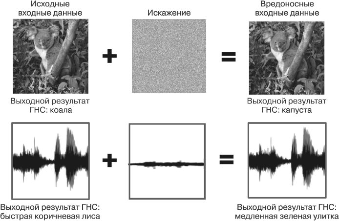 Хотя любой алгоритм машинного обучения в какой-то мере уязвим к вредоносным входным данным, глубокие нейронные сети обладают повышенной степенью уязвимости, поскольку они лучше справляются с задачами, в которых трудно четко определить, по каким признакам данных следует производить обучение. То есть мы слабо представляем, какие аспекты данных важны для алгоритма ГНС, или не понимаем этого вообще. Если мы не понимаем, на основе каких аспектов данных алгоритм принимает решения, то можем ли мы надеяться на проведение хороших тестов для проверки устойчивости алгоритмов? Вредоносные входные данные используют то обстоятельство, что модели глубокого обучения, как правило, имеют дело с миллионами возможных вариантов входных данных, основываясь лишь на небольшом количестве изученных примеров3. Обученные модели должны одновременно обладать и достаточной гибкостью, чтобы справляться с вариабельностью данных, и способностью обобщать новые данные. Как следствие, поведение глубокой нейронной сети остается непроверенным для большинства возможных входных данных и часто может быть неожиданным.