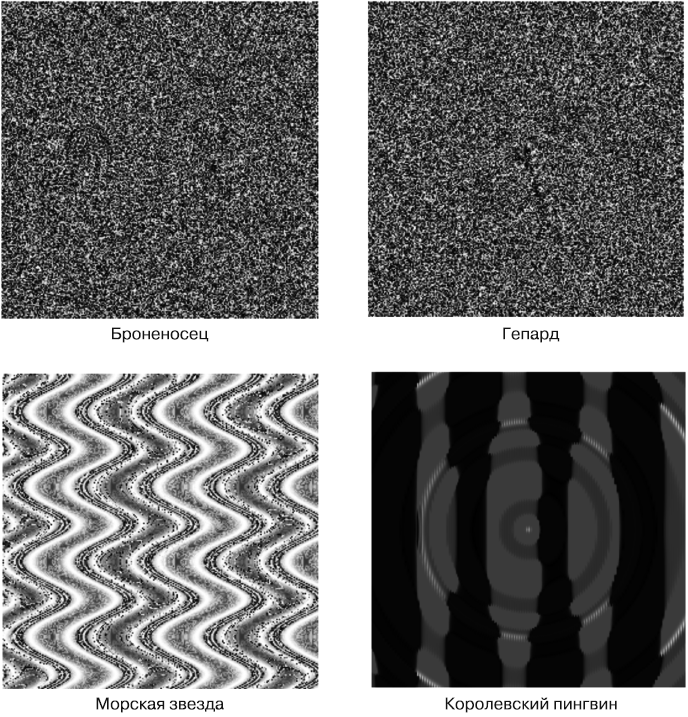 В 2015 году Нгуен (Nguyen) совместно с другими исследователями опубликовал статью под названием «Глубокие нейронные сети можно легко обмануть: высоковероятные предсказания для нераспознаваемых изображений»5. Исследование показало, что, когда неважен реализм изображения, могут генерироваться вредоносные данные, не похожие совершенно ни на что, которые с высокой степенью вероятности будут классифицироваться глубокими нейронными сетями. На рис. 1.4 показаны некоторые примеры, приведенные в этой статье.