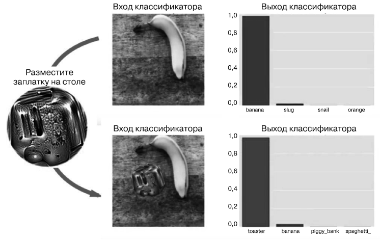 Вредоносные заплатки представляют собой тщательно подобранные «наклейки», которые накладываются на данные. Эти заплатки отвлекают внимание глубокой нейронной сети от релевантных аспектов входных данных, заставляя ее выдать неверный результат. На рис. 1.5 представлен пример вредоносной заплатки, сгенерированной исследователями компании Google. Эта «наклейка» математически оптимизирована так, чтобы с точки зрения ГНС представлять собой более заметный признак, по сравнению с объектом, существующим в реальном мире, что с высокой степенью вероятности обеспечит ошибку классификации.