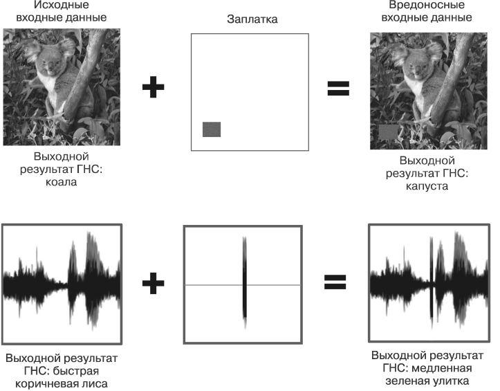 В сфере обработки изображений концепция вредоносных входных данных подразумевает создание оптических иллюзий, которым подвержен только искусственный интеллект. Так, вредоносное изображение может быть сгенерировано путем добавления в изображение кошки множества, казалось бы, неважных пикселей, которые заставят ИИ относить данное изображение к категории «собака», но не внесут в него каких-либо заметных изменений признаков, которые, по мнению человека, являются характерными для собаки. Вредоносные входные данные также могут представлять собой определенные метки на дорожном знаке, которые будут восприниматься человеком как граффити, но в то же время заставят автономное транспортное средство интерпретировать знак неправильно. Можно привести примеры и из сферы обработки аудиоданных. Например, включение в речь слабо слышимых вредоносных команд, ведущих к существенным ошибкам в интерпретации речи системой автоматического распознавания речи. Все эти сценарии обусловлены самими моделями ГНС.