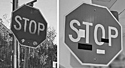 Что интересно, в отличие от описанных ранее атак с помощью цифровых искажений, атаки с использованием искажений в физическом мире зачастую легко распознаются человеком. Поэтому обычно злоумышленник стремится внести изменение окружающей среды так, чтобы человек не воспринял его как нечто необычное. Так, в случаях, показанных на рис. 1.8, можно заметить искажения на знаке остановки, но вряд ли кто-то посчитает их чем-то подозрительным; искажения подобны граффити и потому не воспринимаются человеком как что-то опасное.