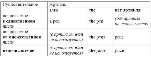Краткое обобщение применения артиклей с существительными неисчисляемыми и исчисляемыми в единственном и множественном числах: