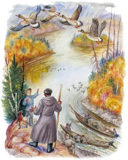 Склонность к пространным рассуждениям, как у всякого таёжника, появилась у Васютки. Он ещё долго думал бы о дороге и о всяких таёжных разностях, если бы не скрипучее кряканье где-то над головой.