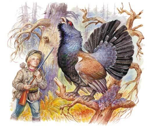 Вдруг впереди Васютки что-то сильно захлопало. Он вздрогнул от неожиданности и тут же увидел поднимающуюся с земли большую чёрную птицу. «Глухарь!» – догадался Васютка, и сердце его замерло. Стрелял он и уток, и куликов, и куропаток, но глухаря подстрелить ему ещё не доводилось.