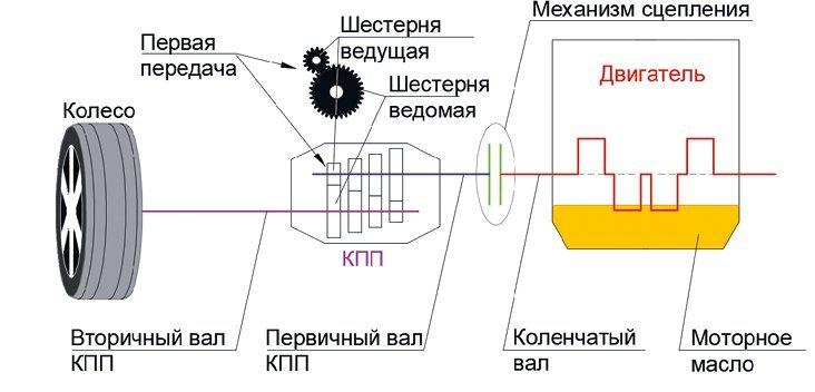 Включаем первую передачу – и у нас ведущая шестеренка (та, что со стороны двигателя) самая маленькая, а ведомая – самая большая. Так двигателю легче всего начать тащить нашу большую и тяжелую железку – автомобиль, трогаясь с места.