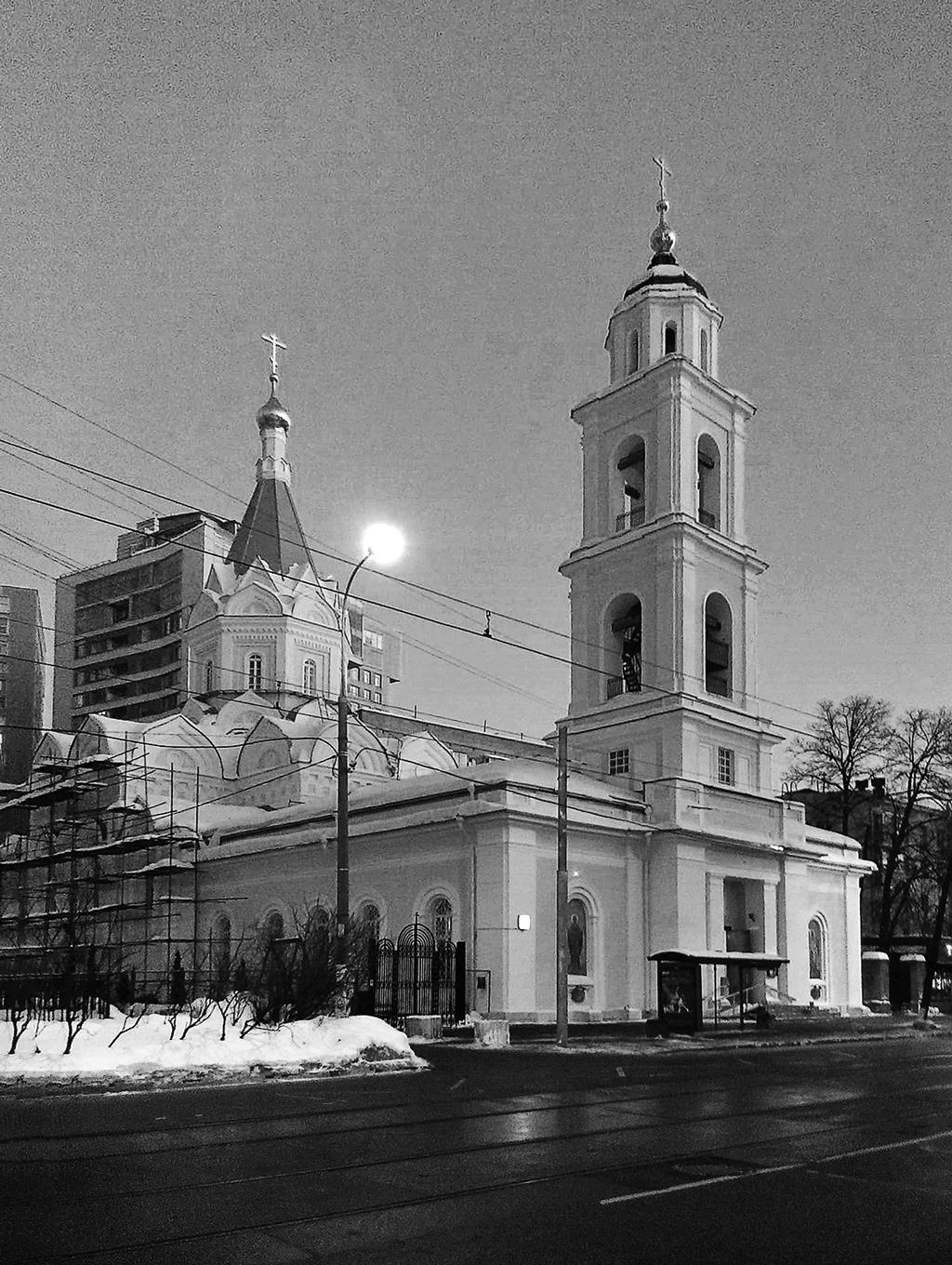 Над храмом Живоначальной Троицы в голубом зимнем небе стоит узкий серп луны. Мимо ходят трамваи. Напротив горит красная вывеска ресторана «Одесса», с боков церковь тоже окружают рестораны и кафе. Так она и высится здесь — светло-зелёная с белизной, тихая.
