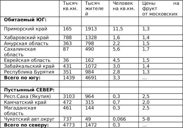 Итак, к «цивилизованному югу» Дальнего Востока относятся Приморский край, Хабаровский край, Амурская, Еврейская и Сахалинская области, Республика Бурятия и Забайкальский край. Здесь относительно много путей сообщения, есть железные дороги и автодороги, почти каждый значительный населённый пункт имеет круглогодичное транспортное сообщение (кроме севера Хабаровского края). Здесь кое-где растут свои овощи, цены более-менее нормальные, несколько выше, чем в Центральной России, но не ужасные. Лето достаточно жаркое, зима холодная, но не смертельная. Людей тут живёт 4,5 миллиона человек. Основной личный транспорт — японские иномарки.