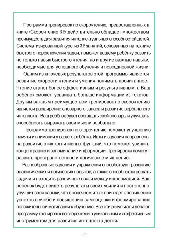 Книга «Скорочтение 32» представляет собой практическое руководство из 32 занятий для развития навыков скорочтения и повышения эффективности чтения. В книге я представляю свои методики и техники, упражнения и уникальные тексты которые помогут детям ускорить свой темп чтения и одновременно повысить понимание и запоминание прочитанного материала, обеспечивая комплексное развитие навыков чтения. Основная цель книги — помочь детям освоить навык быстрого чтения и применить его в повседневной жизни и учебе.